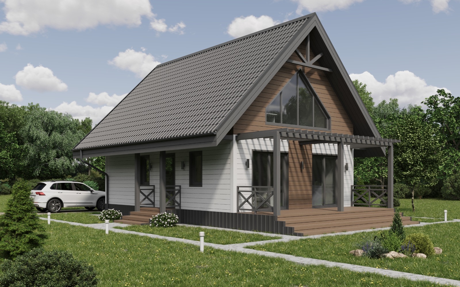 Мы переработали фасад, добавили перголы, уютные террасы и аккуратные архитектурные акценты, подчеркивающие характер дома. Каждый элемент продуман так, чтобы сохранить баланс между функциональностью и современным дизайном.